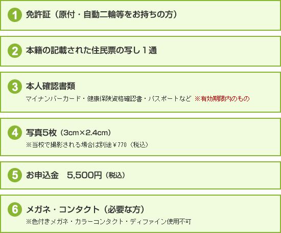自動車学校に入学するための条件や、入校時必要となるものなどがあります。